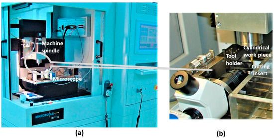 Arrangement of the (a) micromachining center, DT-110, (b) workpiece cutting tool holder and insert for micro turning.