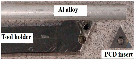 The aluminum alloy workpiece material and the polycrystalline diamond (PCD) insert used as the cutting tool are shown in Figure 10. A commercially available aluminum alloy rod with an initial diameter of 6 mm was selected for the micro turning experiments. Energy dispersive X-ray spectroscopy (EDX) analysis was performed on the workpiece revealing its elemental composition. Figure 11 shows the EDX results (~51% Al by mass) of the workpiece material.