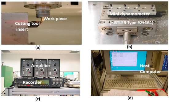 Experimental setup showing (a) cutting tool insert and the vertically oriented workpiece, (b) dynamometer with tool holder, (c) data recorder, and (d) host computer.