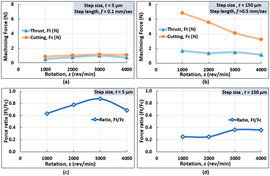 Moreover, the force ratio (Ft/Fc) was determined as shown in Figure 14c,d. For a small step size (t = 5 μm), it is noticed that Ft/Fc increases with step length (f) as illustrated in Figure 14c. At a larger step size (t = 150 μm), as the step length is increased, a reducing trend was noticed similar to that observed in conventional machining [21].