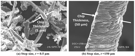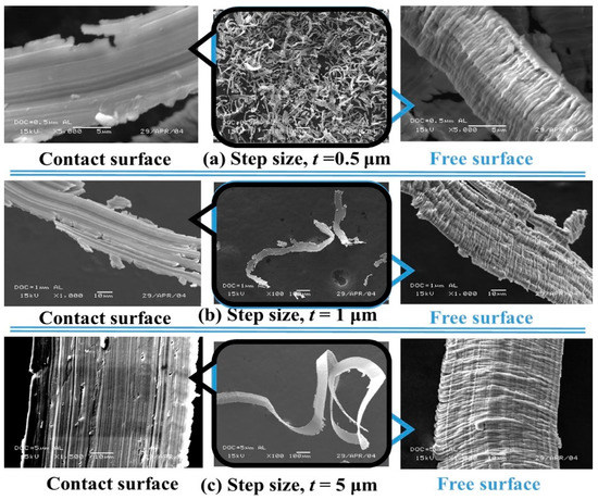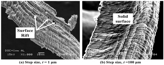 At step size of t = 1 μm, rifted surfaces were noticed, as shown in Figure 17a. This is similar to that observed in shallow undeformed chip thickness in micromachining of Al alloy when the chip formation is governed by rubbing and ploughing [24]. At a large step size, t = 100 μm, the chip formation is dictated by shear deformation to produce the long and continuous chips [25], shown in Figure 17b.