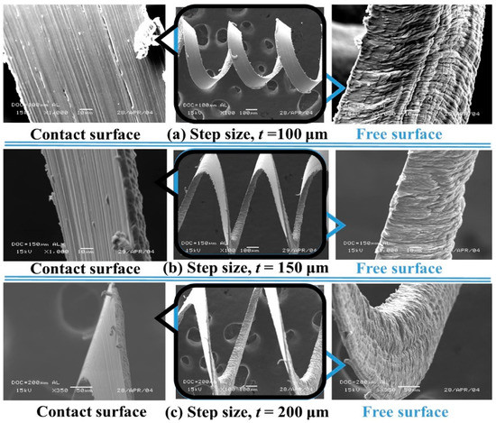 Figure 19a–c shows the SEM images of chips produced at even higher step sizes (t). Under these three conditions, the contact surface became smoother while the free surface exhibited corrugation. Here, an increased step size (t) resulted in the formation of curly and long continuous chips, similar to that produced in conventional machining and macromachining.