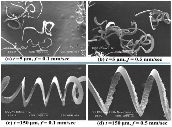 SEM observations of the chips formed from the micro turning of the aluminum alloy with a PCD tool indicated the ductile chip formation under different step lengths or feeds, as shown in Figure 20. With an elevated step length (f) or feed, the increased tool-work contact resulted in the formation of regular curly chips. As the step length (f) increased from 0.1 mm/s to a high value of 0.5 mm/s, at step size of 5 µm and speed of 1000 rev/min, the chip curls became more prominent, as observed in Figure 20a,b. However, at a higher step size (t = 150 µm), the increment of step length (f) resulted in long helical chips, as observed in Figure 20c,d.