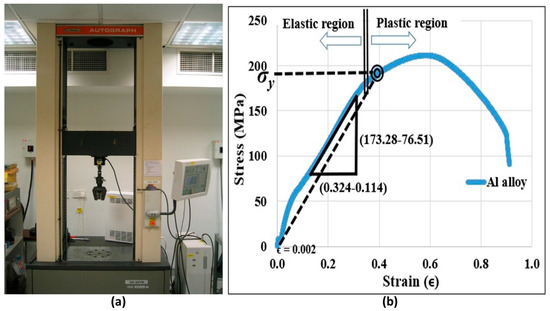 (a) Shimadzu AG-25TB tensile test machine and (b) stress vs. strain graph of Al alloy.