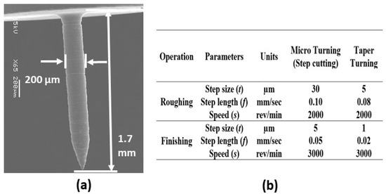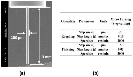 The cutting parameters were selected based on the micro turning of the aluminum alloy, as described in Section 4. Adequate measures were taken to keep the reaction forces as low as possible. Figure 23a shows the SEM image of the fabricated 150 µm diameter and 3.0 mm long shaft. Cutting parameters for this microfabrication process are provided in Figure 23b. It can be seen that the step length for the finishing operation was kept at a small value of 0.02 mm/s to minimize the reaction forces.