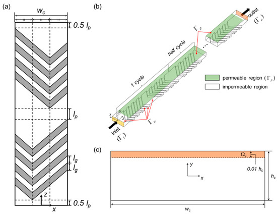 Figure 1 illustrates the periodic unit of the staggered herringbone mixer (SHM) with a flat permeable region (membrane) on top of the microchannel, opposite to the bottom with the herringbone-like grooves, for a microfluidic filtration application. The original design suggested by Stroock et al. [38] is referred to determine our SHM designs. As shown in Figure 1a, the location of the apex of a groove is positioned at a distance 1/3 wc from the sidewall in the first half cycle and at a distance 2/3 wc from the sidewall in the last half cycle, where wc is the channel width. The patterned surface with the grooves creates two counter-rotating cross-sectional flows repeating periodically and inducing chaotic advection [38,40,41]. As the grooves are incorporated in a permeating microchannel, the accumulation of concentration near the permeable wall is expected to be reduced if effective stirring occurs near the membrane surface. Four major design parameters of the SHM — the number of grooves (np), the interspace between two neighboring grooves (lg), the interspace between half mixing periods (lp), and the groove depth (hg) — are selected and manipulated, whose specific values are summarized in Section 2.3, to minimize the development of the wall concentration (See Figure 1a for the details). Other geometric parameters are fixed as in [38]; hc = 77 µm and wc = 200 µm, where hc is the channel height. The slanted angle of the grooves is 45°.