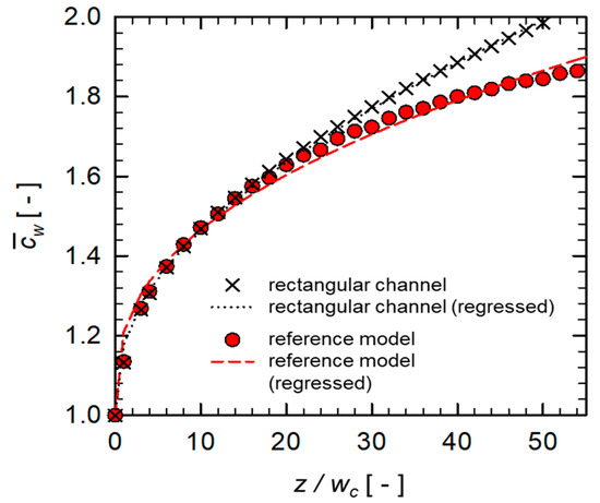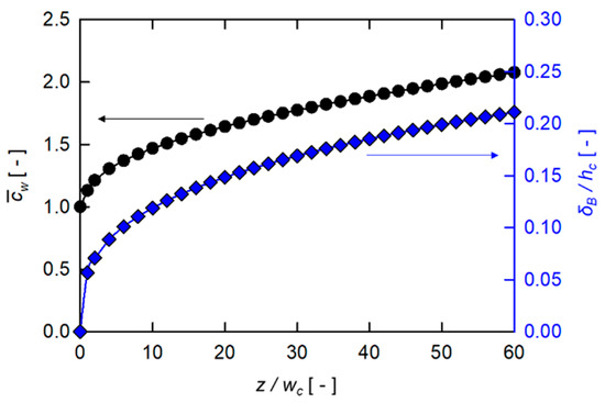 where and (, in this study), which is analogous to that used to define the thermal boundary layer in heat transfer [42]. As expected by Equations (6) and (7) derived from the film theory, the dimensionless wall concentration () and the dimensionless boundary layer thickness () keep increasing with . Since is defined as the surface-averaged wall concentration scaled by the inlet concentration, it starts from the initial value of 1. It should be noted here that , i.e., the power-law index for the plain channel is 0.325, while that predicted from the film theory is 1/3, thus the relative difference of the two values is less than 3%.