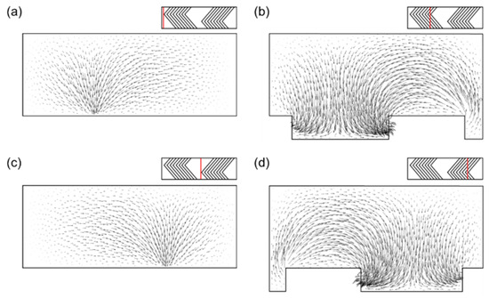 The velocity vector plots at four cross sections showing two counter-rotating flow portraits and downwelling flows in the reference SHM model. Velocity vectors are projected on the cross-sections. The axial location of each cross section is indicated by a red line. Velocity vectors (a) at the first apex in the first half cycle; (b) at the last apex in the first half cycle; (c) at the first apex in the second half cycle; and (d) at the last apex in the second half cycle.