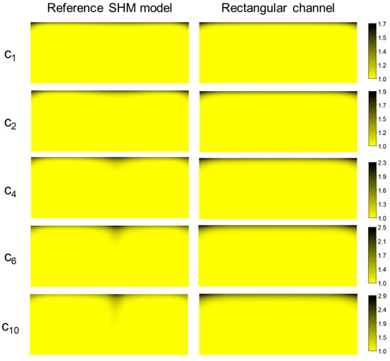 Figure 4 illustrates the cross-sectional concentration distributions in the reference SHM model (where , , , and ) and in the plain rectangular channel, both with the constant permeation velocity on , demonstrating the development of the concentration boundary layer near the permeable region. As for the reference SHM model, the concentration distribution at the end of the five selected periods are shown, where each subscript indicates the corresponding spatial period (i.e., C2 indicates the concentration at the end of the second period, and so on). In the case of the plain rectangular channel, the concentration distributions are plotted at the same cross-sections used in the reference SHM model. Due to the downwelling flows present in the SHM model (See Figure 3), foulants accumulated near the upper wall (permeable wall) were dragged downward, thus slowing down the concentration boundary layer development. Compared to the concentration distribution in the plain rectangular channel, the boundary layer in the SHM model was thinner, especially around , clearly demonstrating that the accumulated mass was back-transported toward the bulk region by the rotational motions of the fluid. However, the wall concentration near the center () was locally high due to the two counter-rotating flow patterns merged at the center. It is apparent that, even though the SHM model is not an optimized one, the flow and mixing characteristics in the SHM lead to the reduction of the wall concentration in an overall sense, compared to the case of the plain rectangular channel.