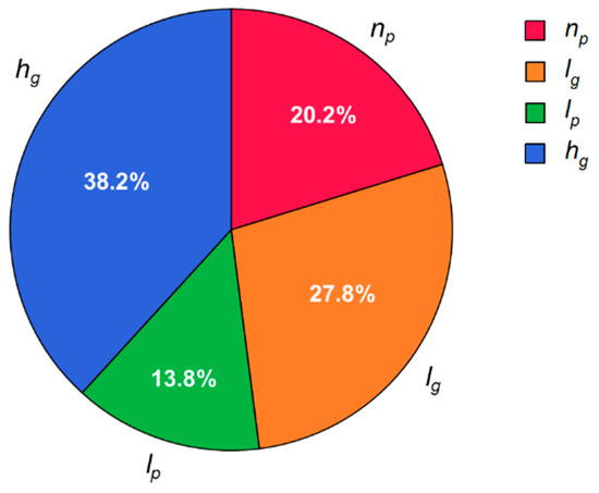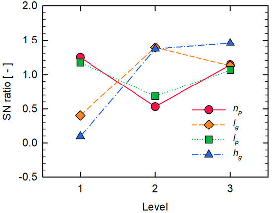 where is the growth exponent of the reference SHM model. By investigating the SN ratio, an optimal combination of design parameters of the SHM model that are expected to minimize the growth exponent would be determined within the limit of the selected levels of the design parameters. The contribution of each design parameter on the performance can be estimated from the Analysis of Variance (ANOVA). Figure 7 shows the SN ratios of different levels in each design parameter. In this plot, the optimal set of design parameters can be obtained by selecting the level with the highest SN ratio for each design parameter. The contribution of each design parameter on the growth exponent, identified by the ANOVA, is shown in Figure 8. It shows that the groove depth is the most significant parameter, while the interspace between two half cycles shows the weakest contribution on the performance. As for , it was reported in previous studies [40,45] that the groove depth is highly related to the strength of the rotational flows induced in the SHM, thus also to the strength of the backtransport of foulants caused by the downwelling flows.