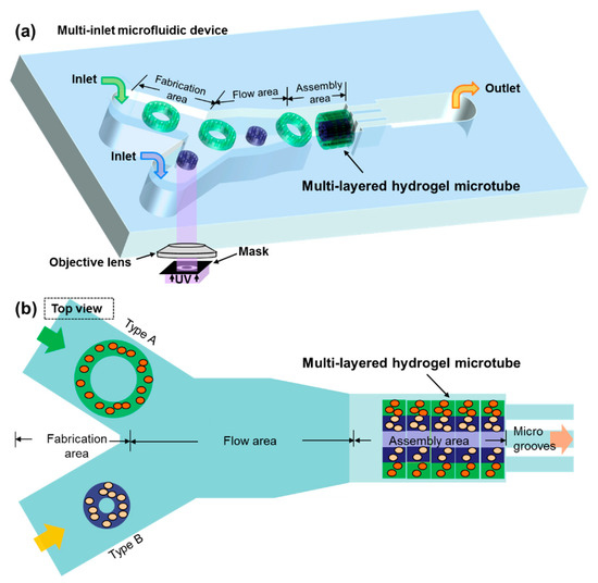 As one type of valuable structures for multicellular models or cell co-culture systems, microtubes with alternating-layered structures are good examples to be fabricated. The complete fabrication method using the presented device is shown in Figure 3. Different types of microstructures with the same diameters were fabricated in each inlet, respectively. Polyethylene terephthalate (PET) masks were set between the UV lamp and the objective lens for patterning the UV light. An objective lens (40×, Olympus, Tokyo, Japan) was used for UV exposure. The UV was illuminated by a mercury lamp (UV intensity 20 mW/cm2, USH-103tems, Olympus) and the exposure time was controlled by a shutter (BSH-RIX, Sigmakoki, Tokyo, Japan). Patterned UV was exposed to the PEGDA and microstructures were fabricated inside the PEGDA solution. Microstructures were fabricated by illuminating the UV for 0.4 s. The flow was controlled by syringe pumps to make sure the microstructures in each inlet were fabricated alternately. Therefore, these two types of microstructures flowed and fell into the assembly area alternately, stopping at the microgrooves one-by-one. Finally, microtubes embedding 2 types of microstructures arranged with an alternating order were constructed.