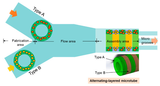 The different types of microstructures are fabricated alternately in separate fabrication areas to assemble alternating-layered microtubes in the assembly area.