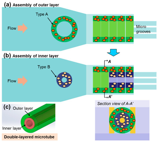 Beyond the structure formation, multicellular components are key elements for building functional tissue, as each type of cell has their own unique role inside the complex system of tissues [36]. For instance, several cell types can be found in the mammalian gut endothelium, including pit cells, parietal cells, zymogenic cells, and enteroendocrine cells. All these cells have defined positions and contribute to the gut endothelium in order for the complex structure to function properly [37]. A method to achieve multicellular 3D structures is becoming an important issue [38,39] and such technology would contribute significantly by revealing cell–cell interactions and functionalization factors [40]. Inside the multicellular environment, cell groups stimulate each other and form functional tissues [41,42]. Simple vascular-like microtubes have been assembled inside microfluidic channel [43]. However, these simple vascular-like hollow microtubes have contained only one type of cell, which limits their practical functionalization as artificial vascular structures. Construction of tubular structures with several different layers is a promising way to build engineered vascular-like structures, which serves the long-term target of building artificial blood vessels [44].