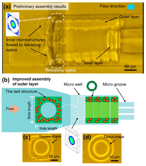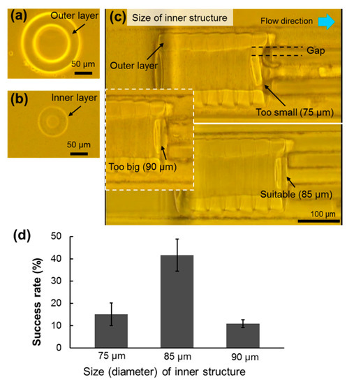 As shown in Figure 7a, there were many inner microstructures that flowed into the releasing space and blocked the entrance of the hollow. It was difficult for the microstructures of the inner layer to flow into the hollow of the outer layer, because of these assembly failures. The inner structures failed to flow into the hollow of the outer layer and were blocked outside. This resulted in a bad assembly with about 40% success rate, as shown for the 85 μm case in Figure 6d. Therefore, modification of the releasing space and improvement of the flow condition for assembling the inner layer are needed.