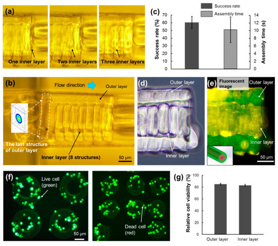 In order to confirm that the presented method could be used in biological applications, cell viability evaluations were conducted after the cells were encapsulated inside the microstructures. Fluorescent images of the evaluation results are shown as Figure 8f. The green represents live cells, whereas the red represents dead cells. The two different microstructures for the outer layer and inner layer were both tested. Figure 8g shows that the relative cell viability of all the samples is higher than 80%, which confirms that they are able to be applied for biological applications.