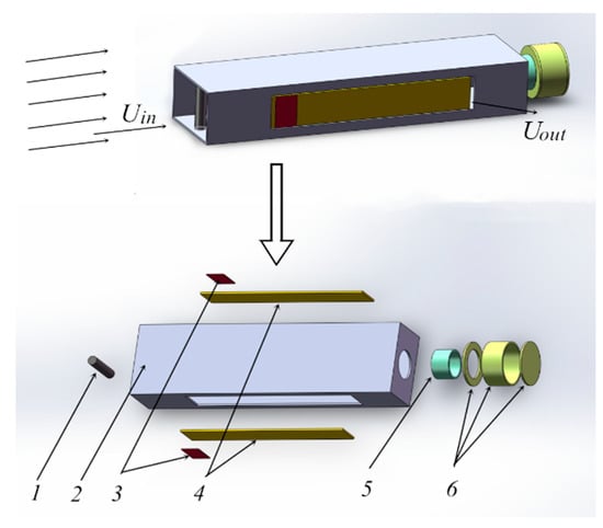 Schematic of the resonant cavity piezoelectric energy harvester: (1) Spoiler cylinder; (2) main cavity; (3) piezoceramics; (4) substrate; (5) Helmholtz cavity short tube; (6) Helmholtz resonator cavity.