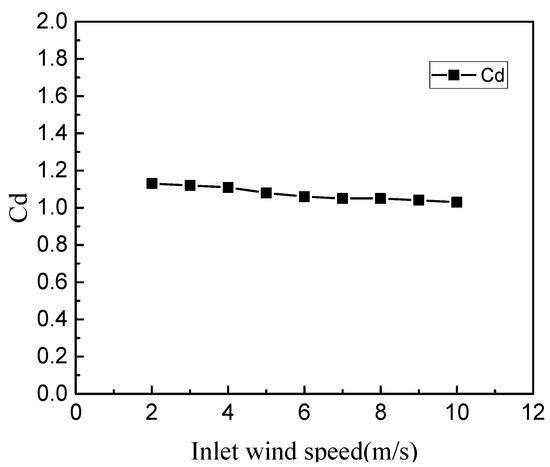 The inlet wind speed is set from 2 m/s to 10 m/s, and the step length is 1 m/s. The remaining parameters are not changed. Finally, the resistance coefficient of the spoiler can be calculated. The results from our analysis are shown in Figure 3.