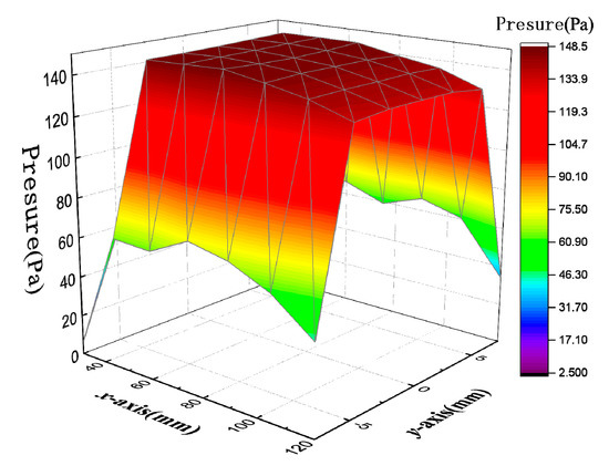 The pressure distribution of each node on the inner surface of the substrate in the wind field was extracted from the analysis results. The pressure distribution law is shown in Figure 4, where the x-axis is the length of the substrate, with a range of 30–120 mm, the y-axis is the width of the substrate, with a range from −7.5 mm to 7.5 mm, and the z-axis is the pressure value, with a range from 0 Pa to 150 Pa.