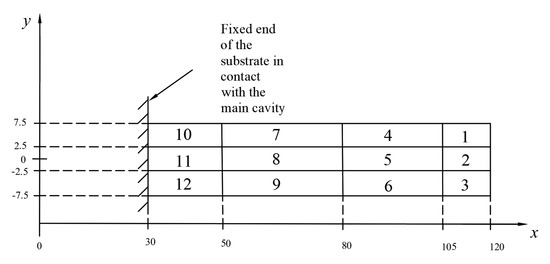 As can be seen from Figure 4, the pressure in the x-direction was increased first and then decreased, but the change was small. When the y-coordinate range was from −7.5 mm to −2.5 mm, the pressure increased linearly with the increase of the y-coordinate value. When the y-coordinate range was from −2.5 mm to 2.5 mm, the pressure did not obviously change with the increase of the y-coordinate value. When the y-coordinate range was from 2.5 mm to 7.5 mm, the pressure decreased linearly with the increase of the y-coordinate value. According to the distribution of wind pressure on the substrate in the wind field, the substrate can be divided into 12 regions, as shown in Figure 5.