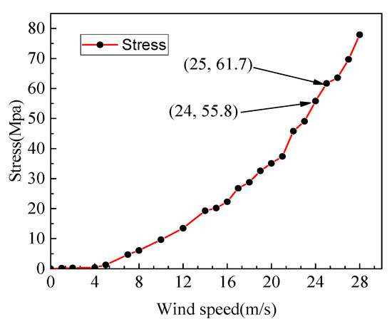 After the simulation calculation, since the maximum Mises stress generated on the substrate did not exceed 200 MPa, which is much smaller than its allowable stress, the relationship between the maximum Mises stress on the substrate and the wind speed is not listed here. Figure 6 is a graph showing the relationship between the maximum Mises stress of the piezoelectric piece and the wind speed.