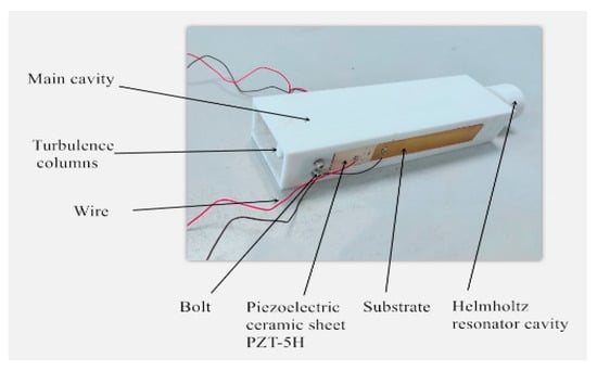 The resonant cavity piezoelectric energy harvester model is mainly composed of wires, a main cavity, a spoiler cylinder, a bolt, two piezoelectric ceramic pieces, two substrates, and a Helmholtz resonant cavity. The main cavity, the spoiler cylinder, and the Helmholtz resonator were modeled in SolidWorks and then processed separately using 3D printing technology, where the material used was PLA. The left and right sides of the main cavity both have a rectangular groove, with a length of 96 mm and a width of 16 mm, for fixing the piezoelectric cantilever beams. The material of the substrates used was beryllium bronze, which was cut by a cutter. The piezoelectric ceramic pieces used the PZT-5H piezoelectric ceramic pieces produced by the Hebei Hongsheng Acoustic Electronic Equipment Co., Ltd. The size of the piezoelectric piece was 10 mm × 15 mm × 0.4 mm. A through-hole was formed at the entrance of the main cavity and was assembled with the spoiler cylinder. The main cavity has a round hole at the end was assembled with the Helmholtz cavity. The piezoelectric cantilever beam was fixed on both sides of the main cavity by M3 bolts. The piezoelectric cantilever beam was made by bonding the PZT-5H to the substrate by epoxy resin containing copper powder. Two wires were spot-welded on the positive surface of PZT-5H and the substrate.