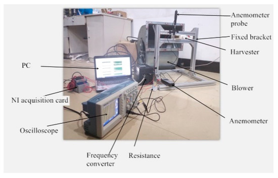 The experiment platform, as shown in Figure 8, was constructed. The experimental study on the output characteristics of the resonant cavity piezoelectric energy harvester was carried out.