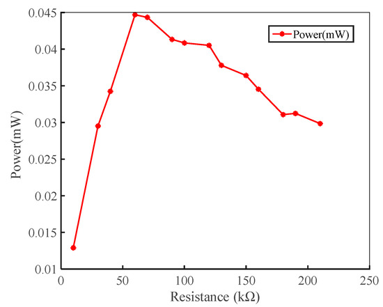 It can be seen from Figure 10 that when the wind speed is 10 m/s, the output power firstly increases and then decreases with the increase of the load resistance. When the load resistance is 60 kΩ, the output power of one side piezoelectric cantilever beam reaches a maximum of 45 μW. In this experiment, the optimal resistance of the piezoelectric energy harvester was 60 kΩ.