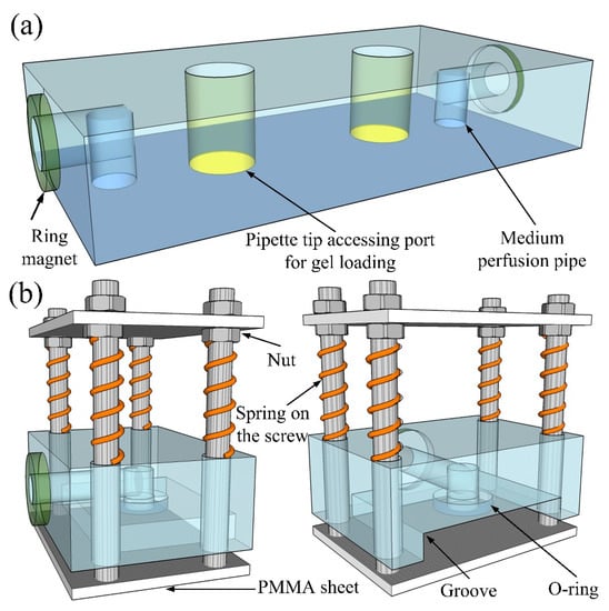 The schematic of the clamping-based RSUIM design is shown in Figure 1b. Both the magnetic interconnection and medium perfusion pipe were the same as that in the pasting-based RSUIM design. In addition, four holes were drilled at the corners of the PMMA module to facilitate the fixing with four screws and two PMMA sheets. The upper PMMA sheet was fixed between two nuts, and the lower sheet was screwed and bonded with epoxy. Between the upper surface of this PMMA module and the nut below the upper PMMA sheet, four springs with an inner diameter slightly larger than the screw were placed, which could flexibly move the lower PMMA sheet up and down to complete the clamping of the organ-on-a-chip module. Furthermore, in order to realize the robust fixing and tight interconnection, a groove with an O-ring (8 mm OD × 5 mm ID × 1.5 mm thick) was fabricated below the PMMA module, whose depth was smaller than that of the organ-on-a-chip module. In addition, the thickness of the O-ring was larger than the depth of the recess (1 mm) on the groove, which could prevent fluidic leakage during medium perfusion.