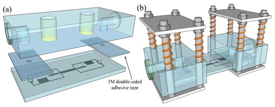 For the pasting-based RSUIM assembly, 3M acrylic double-sided transparent adhesive tape (3M, Shanghai, China), with a thickness of 1 mm was utilized as the sealing gasket, as shown in Figure 3a. Holes with the diameter of 2 mm were punched at each adhesive tape, whose sizes were slightly larger than those of the medium perfusion ports on the organ-on-a-chip module, but much smaller than those of the medium access ports on the RSUIM for easy assembly. It should be noted that due to the inherent low adhesive capability between adhesive tape and the PDMS-based organ chip, the surface of the organ chip should be pre-treated with special treatment agent for silicon rubber (XH-211, Xinhui company, Wuhan, China), which enabled tight adhesion after the treatment.
