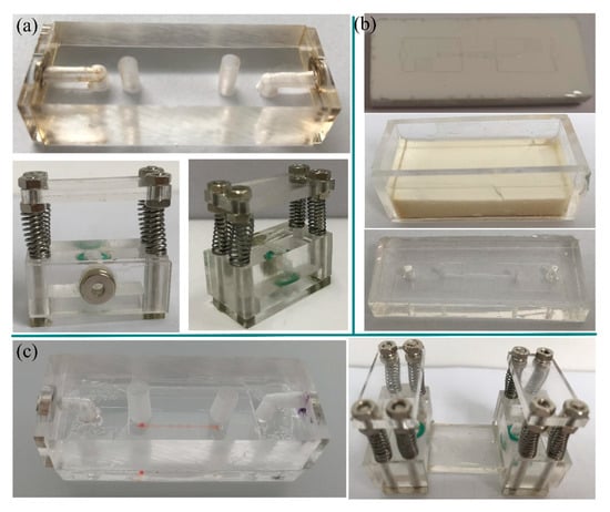 Since it would be costly and cumbersome to fabricate the magnetic interconnect by embedding and/or fixing magnets into microfluidic chips, the developed RSUIM provides a low-cost and convenient solution to achieve a robust and flexible interconnection between different modular chips. Thus, the basic requirement for these RSUIMs should be recyclable, easy to fabricate, and most importantly, consistent and reliable after reusing several times. Due to the transparent property and mature processing technique using laser cutting, PMMA is the optimal material to fabricate the RSUIM. Figure 4a shows the prototype of pasting-based RSUIM and clamping-based RSUIM, respectively. Furthermore, since the dimensions of the organ-on-a-chip module will directly determine the parameters of the RSUIM, it is necessary to realize the standardization and universalization of the chip module. Here, a customized polyurethane master mold of the microfluidic chip was fabricated using 2-part polyurethane liquid plastic (Smooth Cast 310, Smooth-On Inc., Macungie, PA, USA) [], as shown in Figure 4b. The whole size of the organ-on-a-chip module was determined by a customized PMMA frame, and the microfluidic chip was casted by pouring PDMS into it. Figure 4c shows the assembled pasting-based RSUIM and clamping-based RSUIM with the fabricated generic vascularized organ-on-a-chip module, respectively. The polarity of the magnetic interconnect in each assembled RSUIM was kept to be the opposite, which was convenient for the future interconnection of different assembled RSUIMs.
