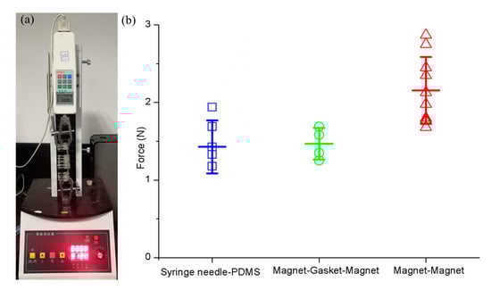 The holding strength of interconnected RSUIM through a magnet was characterized by using a tensile test machine (SH-50, SUNDOO, Wenzhou, China). Briefly, the interconnected devices were fixed in the clamps of the tensile test machine and withstood the increased separation force. The maximum holding force was defined as the force required to separate these two RSUIMs completely. For comparison, the holding strengths of both syringe needle PDMS and magnet-gasket-magnet modules were measured in the same way.
