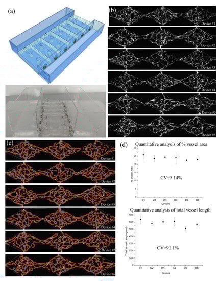 Due to the flexibility of the modular design, it was simple to integrate multiple assembled modular devices in a high throughput manner. Figure 7a shows the parallel culturing within six parallel pasting-based assembled modular devices connected to two medium reservoir modules with multiple medium access ports. Successfully loaded devices could develop robust and uniform vascular networks within seven days, as shown in Figure 7b. Furthermore, the vessel area percentage and total vessel length inside each tissue chamber were analyzed to assess the reproducibility of the vascular formation in each successfully loaded device on the same platform (Figure 7c). Quantification results demonstrated that the percent vessel coverage and total vessel length between the tissue chambers (n = 18 tissue chambers) on a single platform (n = 6 devices) were highly consistent, with a coefficient of variation (CV) equal to 9.14% and 9.11%, respectively (Figure 7d).
