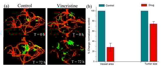 In addition to vascularization, we also realized the vascularized tumor model through the assembled pasting-based RSUIM device by co-culturing tumor spheroids with the microvascular network, as shown in Figure 8a. In the control group, due to the continuous cell culture medium perfusion, both the microvascular network and tumor spheroids grew gradually. Specifically, the microvascular network became mature and lumenized, while the size of the tumor spheroids increased after 72 h. However, after adding vincristine as the experimental group, which is known as an anti-cancer chemotherapy drug to destroy tumor blood vessels, the change of microvascular area and tumor size decreased to 26.4 ± 8.65% and 68.9 ± 5.09% normalized to the control group (n = 4), as shown in Figure 8b. The preliminary experimental results were in accordance with its clinical testing results.