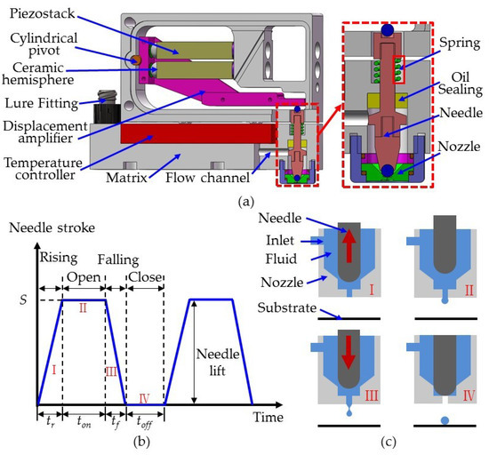In order to study the influence of needle structure on the dispensing process, an on–off valve piezostack-driven dispenser was used, the configuration of which is shown in Figure 1a. Figure 1a also shows the displacement amplification and jetting mechanisms. For the displacement amplification mechanism, a cylindrical pivot was connected to a matrix and displacement amplifier. Two piezostack actuators with ceramic hemispheres were symmetrically distributed at both ends of the lever arm of the displacement amplifier. The jetting mechanism was separated from the displacement amplification mechanism, and was composed of a nozzle, needle, flow channel, temperature controller, Luer fitter, and spring, as well as an oil seal. The Luer fitter was connected to a cylinder containing various fluids, which entered the nozzle cavity through the flow channel. Under the action of the spring, the needle remained in contact with the end of the displacement amplifier. When the upper and lower piezostack actuators alternately elongated during dispensing, the displacement amplifier rotated a small angle, causing reciprocating movement in the needle. Figure 1b,c shows the jetting process of the dispenser. When the dispenser was energized, the lower piezostack actuator elongated, the upper piezostack actuator maintained its original length, and the displacement amplifier rotated a small angle clockwise, driving the needle until it reached the lowest position. At this time, the needle stroke was considered zero. According to the different phases of the needle and nozzle in the dispensing process, four stages were recognized, namely stage I, II, III and IV. In stage I, the upper piezostack actuator elongated, the lower piezostack actuator resumed its original length, and the needle rose. At this point, fluid entered the gap between the nozzle and needle under feed pressure. During stage II, the upper piezostack actuator reached its maximum elongation, the lower piezostack actuator maintained its original length, and the needle reached its highest position. Here, the nozzle opened and the fluid flowed out from the nozzle outlet. In stage III, the upper piezostack actuator returned to its original length and the lower piezostack actuator extended. Then, the needle dropped rapidly, producing a large shear force that overcame the viscous forces of the fluid, breaking the jet. Finally, at stage IV, the nozzle closed, and the fluid formed a round droplet on the substrate. Stages I–IV form a complete cycle of dispensing, with durations tr, ton, tf and toff, respectively. Therefore, dispensing cycle T = tr + ton + tf + toff.
