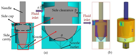 For the purpose of obtaining the universal law, a fluid dynamics simulation of the dispensing process was carried out, and the influence of each parameter on both the velocity of the fluid and volume of the droplet was analyzed. In this study, a needle with a side cap was designed to increase the pressure in the nozzle cavity and the velocity of the jet, so that the fluid was able to flow out more easily. The side cap was also expected to have a particular role in inhibiting reflux. Moreover, a spherical–conical combination of needle and nozzle was selected, which had good sealing performance. Figure 3a shows the parameter dimensions of the simulated mold. The initial parameters of the model were set as follows: conic angle α of needle was 20°, conic angle θ of nozzle was 90°, and side clearance β was 0.1 mm. In addition, the length of the nozzle pipe was maintained at 1 mm, the aperture of the nozzle at 0.15 mm, and the diameter of the needle head at 2.5 mm. Mesh generation is shown in Figure 3b. As the structure was not symmetric about the central axis, the three-dimensional model was adopted for simulation. The whole structure was divided into four grid blocks to save computing resources. Among them, mesh 3, being at the contact site between the needle and the nozzle, contained fine structures, so that the mesh needed to be refined.