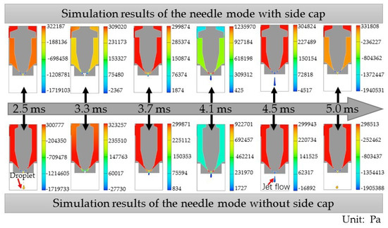 While keeping the other variables consistent, a needle without a side cap was employed for comparison. The dispensing processes of the second cycle are shown in Figure 5. It can be seen from the results that the needle model with a side cap had an enhanced squeezing effect on the fluid, with the jet flow possessing a higher jetting velocity. At 2.5 ms, the droplet of the previous period was still within the boundary of the needle model without a cap, while the droplet had flown out of the boundary in the simulation of the needle model without a cap. At 3.3 ms, the fluid filled the step groove more quickly in the case of the needle model without a side cap. Because the gap between its nozzle seat and needle was larger, the feed pressure’s squeezing effect on the fluid was more apparent, and therefore squeezed more fluid out of the nozzle outlet. At 3.7 ms, pressure in the nozzle cavity of the needle models with and without a side cap were essentially equal. At 4.1 ms, pressure in the nozzle cavity of the needle model with a side cap was greater than that of the needle model without a side cap. During the falling process of the needle, the needle model with a side cap inhibited fluid reflux in the cavity, providing more energy to the jet. At 4.5 ms, the jet flows produced by both models were broken. Moreover, the jet velocity of the needle model with a side cap was greater than the model without a side cap, which can be observed by comparing the results obtained at 5.0 ms.