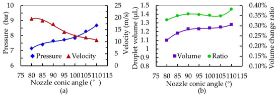 The influence of nozzle conic angle on the dispensing process. (a) Effect on the pressure in the cavity and velocity at the nozzle outlet and (b) effect on the droplet volume and volume change ratio in the nozzle cavity.