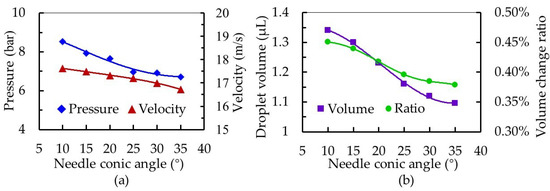 The influence of needle conic angle on the dispensing process. (a) Effect on the pressure in the cavity and the velocity at the nozzle outlet and (b) effect on the droplet volume and volume change ratio in the nozzle cavity.