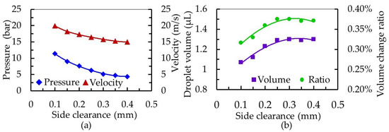 In the nozzle cavity, the value attributed to the side clearance between the needle and the inner wall of the nozzle affects the stability of the fluid supply, and the smaller the side clearance, the stronger the back suction and squeeze effect. From the results shown in Figure 9, as the side clearance increased from 0.1 to 0.4 mm, the pressure in the nozzle cavity decreased from 11.41 to 4.38 bar, and the jet velocity decreased from 19.95 to 14.98 m/s. Furthermore, this side clearance increase was associated with a droplet volume increase of 1.07 to 1.30 μL and an increase of the volume change ratio in the nozzle cavity, from 0.316% to 0.371%. When the side clearance increased to more than 0.25 mm, a reduction in the squeeze pressure made the advantage of a timely fluid supply no longer obvious, and the change of droplet volume tended to be stable. Although the volume change ratio in the nozzle cavity increased with an increase of the side gap, energy loss caused by fluid backflow was serious, leading to an increase in pressure in the nozzle cavity. In addition, the small clearance made jet velocity larger, but the resistance of fluid flowing through the clearance increased. When the needle moved, the amount of fluid in the overflow space per unit time was less than that of the large clearance. Therefore, on the basis of sufficient fluid supply of a dispenser, it is possible to obtain smaller droplets by controlling the working frequency of the dispenser.