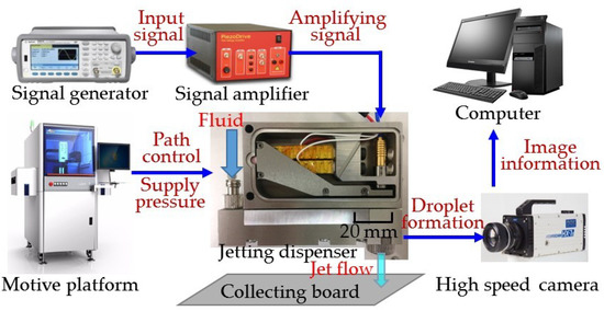 Fluid dispensing technology controls the quantitative distribution of liquid to specific areas in a device [1,2,3]. Nowadays, dispensing systems are widely used in many fields and industries, including in the photovoltaic solar energy industry, medical applications, light emitting diode (LED) technology and the electronic component packaging industry [4,5,6]. According to the dispensing principle, dispensing systems can be divided into contact dispensers and jetting dispensers. The needle of contact dispensers needs to be in contact with the substrate, which means it is easy to damage the device. In addition, contact dispensers have low efficiency, and since the dispenser squeezes the fluid by applying air pressure, piston movement or screw rotation, the size accuracy of droplets is difficult to control and therefore challenging for use in the packaging of micro-devices in Micro Electro Mechanical Systems (MEMS) and other fields [7,8,9].