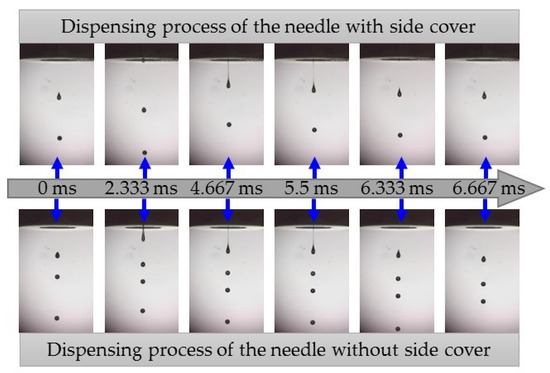 The dispensing process was recorded using a high-speed digital camera, with some of the images captured presented in Figure 11. At a frequency of 150 Hz and a duty cycle of 20%, the results showed that the needle with a side cap enabled jet flow to fall faster than the needle without a side cap. The imaging interval of the high-speed camera was set to 6000 frames per second. Therefore, 40 images were able to be obtained in one allocation cycle with an interval of about 1/6000 s. Meanwhile, the last image of the previous cycle was considered the beginning of the next cycle. We selected some images for comparison. For the dispenser with the needle without a side cap, the fluid flowed out of the nozzle aperture earlier, but the breakup time of the jet was basically consistent with that of the needle with a side cap. In the dispensing process of the needle with a side cap, the number of droplets in the imaging field of the high-speed camera was fewer than that for the needle without side cap. This means that the needle with a side cap had an enhanced squeezing effect on the fluid, so that the falling velocity of the jet was large after breaking.