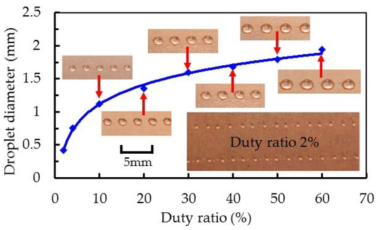 Relationship between square-wave duty cycle and droplet diameter (nozzle diameter: 200 µm; feed pressure: 3 bar; voltage amplitude: 144 V; frequency: 100 Hz; viscosity: 500 mPa∙s).