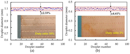 Variation in the droplet diameters for the jetting dispenser. (a) Duty ratio is 10% and (b) duty ratio is 2% (nozzle diameter: 200 µm; feed pressure: 3 bar; voltage amplitude: 144 V; frequency: 100 Hz; viscosity: 500 mPa∙s).