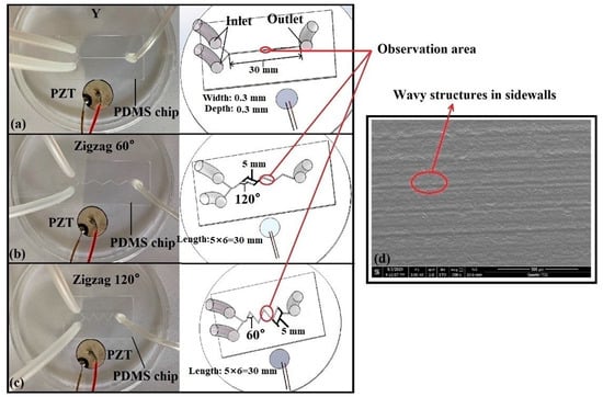 PDMS microfluidic chip: (a) Y-shaped (straight) microchannel, (b) zigzag microchannel with an angle of 120°, (c) zigzag microchannel with the angle of 60°, and (d) SEM image of the wavy microstructures of the microchannel sidewalls.