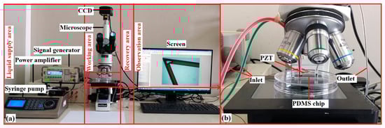 A piezoelectric transducer (PZT-3000 kHz, H4P163000, Fukuda Ultrasound Co., Ltd., Guangzhou, China), polydimethylsiloxane (PDMS, Sylgard 184, Dow-Corning, Midland, MI, USA), a lithography machine (ABM/6/350/NUV/DCCD/M, ABM, New York, NY, USA), a positive photoresist (ma-N 400, Micro Resist, Berlin, Germany), a charge coupled device (CCD) and microscope (Obvious Ltd., Co., China), a syringe pump (LSP01, Longer, Baoding, China), a signal generator (DG1022, Rigol, Beijing, China), a power amplifier (2375, TEGAM, Geneva, OH, USA), dilute hydrochloric acid and sodium carbonate solutions (Thermo Fisher, Waltham, MA, USA), and glycerol (Zibo Hije Chemical Ltd., Co., China) were used in this study.