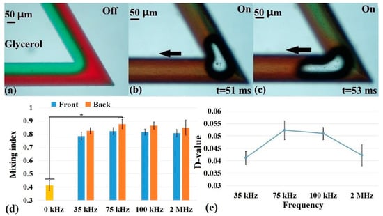 High-viscosity glycerol mixing conditions: (a) no mixing occurred when the acoustic field was powered off, (b,c) the microbubble motion at the corner of the zigzag microchannel when the acoustic field was turned on, (d) comparison of the mixing effect at the fronts and backs of the microbubbles under different driving frequencies, and (e) D-value comparison of the microbubbles under different driving frequencies. (n = 5, Mean ± SD, *: p < 0.05).