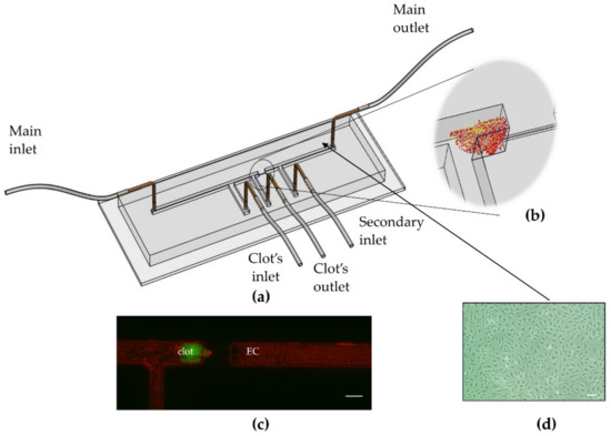 Calcium chloride (1 mol/L) was added to citrated human whole blood at a 5:1 ratio, to allow recalcification of the blood. Human fibrinogen plasminogen-depleted (5 mg/mL, Enzyme Research Laboratories) was added to stabilize the clot and increase its stiffness [16]. Human alpha-thrombin (1 u/mL, Enzyme Research Laboratories) was added to initiate clot formation. The solution was immediately injected into silicone tubes (Tygon, I.D. 0.79 mm) [17] and clots were incubated at 37 °C, overnight, to allow maturation. Clots were cut to 2 mm size in length and then incubated in saline for one hour prior to being inserted into model. Then a single clot was injected into the microfluidic device and allowed to occlude the entrance of the endothelialized vascular compartment (Figure 1c).