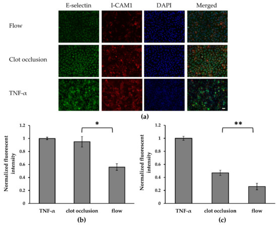 As a first step we tested whether embolic occlusion in our device results in EC activation. Staining of E-selectin and I-CAM1 was done following 2 h under the following conditions (a) channels perfused with serum free medium (unblocked), (b) channels obstructed by an emboli and (c) channels perfused with the inflammatory cytokine TNF-α at (0.1 µg/mL) in serum free media. TNF-α is known to induce a long-term inflammatory response by stimulating inflammatory mediators and proteases, thereby promoting endothelial cell activation [24]. As shown in Figure 2, indeed exposure to TNF-α caused a profound increase in the expression of both E-selectin (green) and I-CAM1 (red). Importantly, a significant increase in both receptors was measured in the embolic occlusion model compared to the results in the perfused devices. These results confirm that upon embolic occlusion in the designed device, the basal levels of both receptors increase, indicating EC activation.