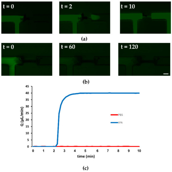 To regain perfusion, we prepared a thrombolytic solution composed of tPA and PLG supplemented with FITC-dextran for fluorescence labeling. tPA is a protease that converts PLG into plasmin (PLS). PLS is the final product in the thrombolysis cascade, that dissolves the fibrin mesh and ultimately the blood clot [25]. Currently the only Food and Drug Administration (FDA)-approved therapy for ischemic stroke is the alteplase, which is recombinant tPA [26]. The therapy involves the intravenous infusion of alteplase, to dissolve the clot. Although the treatment is critical it has a sever side effect, intracerebral hemorrhage (ICH) [27]. To simulate a thrombolytic treatment in our model, a blood clot was inserted, and occlusion of the vascular compartment was confirmed. Then to restore flow, a thrombolysis solution was introduced to the pre-occluded side; a physiological pressure gradient of 60 mmHg was maintained using a pressure-controlled system. Upon administration of the thrombolytic drug, within <10 min clot degradation occurred (Figure 3a), and flow was restored as measured using a flow sensor (Figure 3c). However, when the same saline solution with FITC-dextran excluding the tPA was injected, the clot remained stable (>2 h) under the same pressure gradient and no flow was re-established, see Figure 3b,c. Thus, these results demonstrated the ability to replicate thrombolysis-based reperfusion following an embolic occlusion.