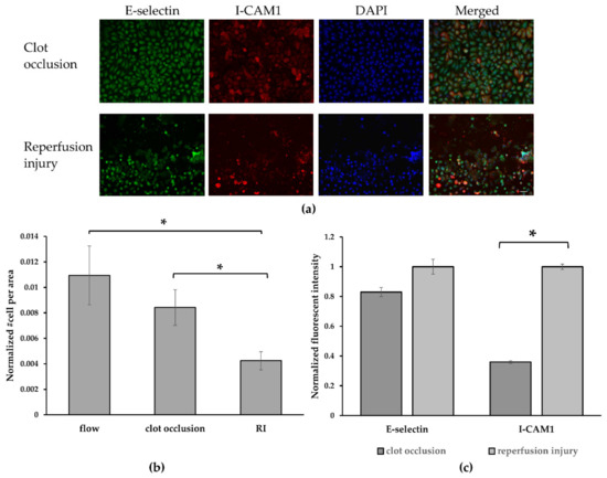 In this study, we examined an alternative in vitro microfluidic model to investigate, in a controlled manner, IRI following an embolic event. The model focused on simulating the injury to the endothelium, using a vascular compartment comprising human endothelial cells, which was subjected to an embolic occlusion and then to IRI as a result of restoration of flow via thrombolytic treatment. IRI is a highly complex condition, that involves proinflammatory and various pathophysiology processes. In this study, we focused on EC receptor overexpression as an indicator of EC activation, a known condition that occurs in IRI [28,29]. We confirmed in the microfluidic model that embolic vascular occlusion (>2 h) increased EC activation as compared to the perfused channel (Figure 2), as shown by significant elevation of both E-selectin and I-CAM1 levels. These results might be attributable to hypoxia or to other changes in the cellular micro-environment as a result of the occlusion and lack of an adequate medium supply. Additionally, experiment where reperfusion was established using a thrombolytic drug confirmed that reperfusion induced further cellular damage then caused by ischemia/occlusion. Under reperfusion, we noticed significant cell detachment from the microfluidic model and significantly increased I-CAM1 levels as compared to their levels in the ischemic channel. Although, E-selectin levels were elevated compared to normal flow, they increased to the same extent as they did during the occlusion conditions. This could be attributed to the fact the E-selectin is more sensitive to culture conditions and is also activated more rapidly, while I-CAM1 overexpression is a process that occurs over a long-time range and is more stable.